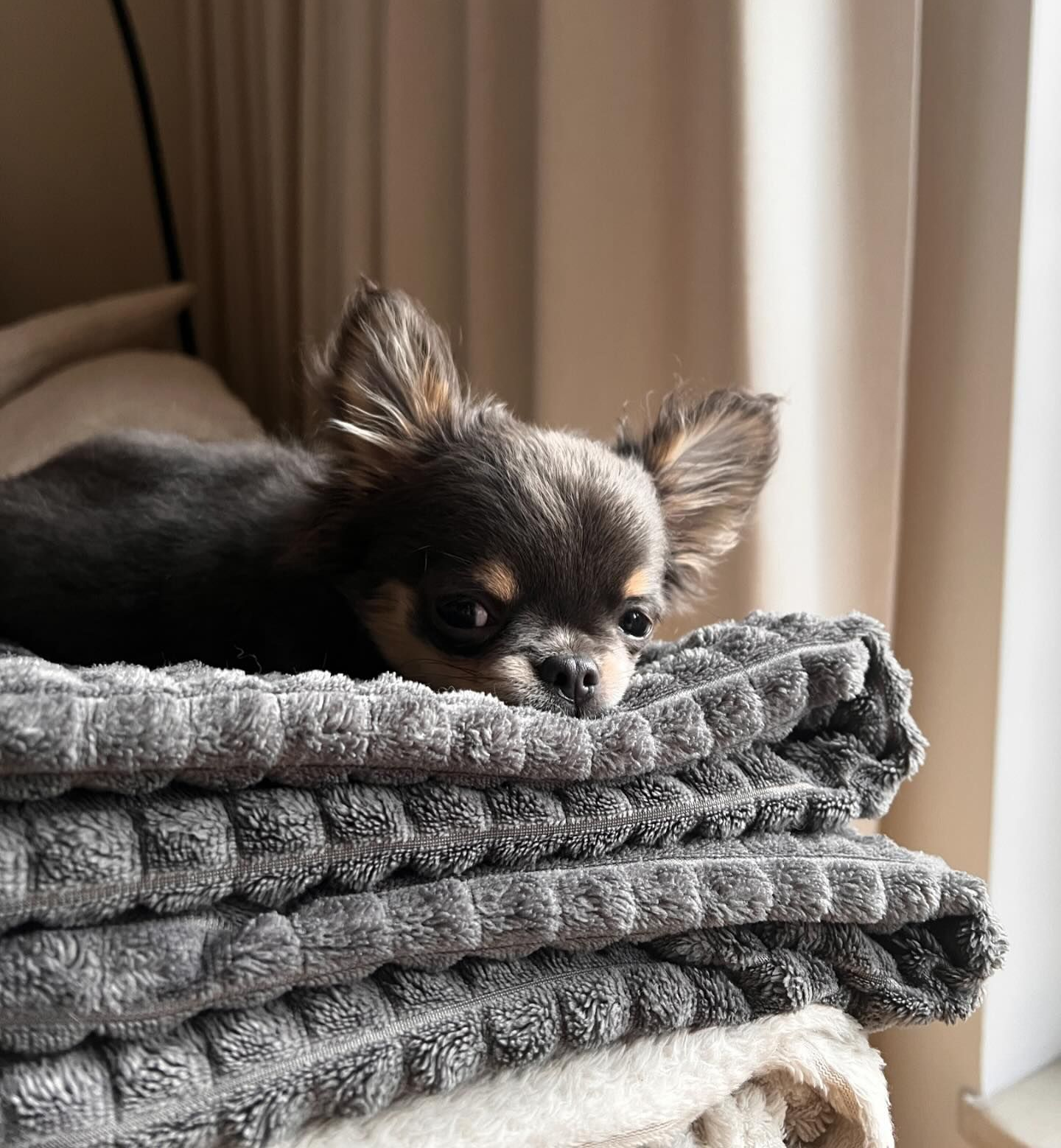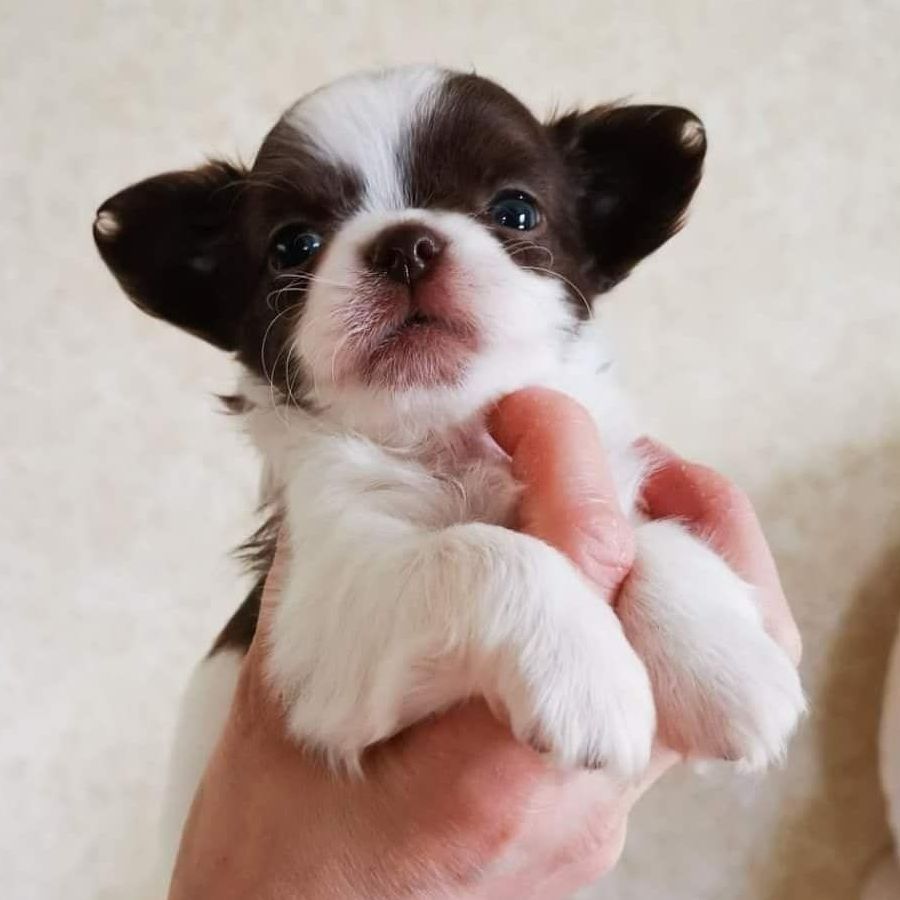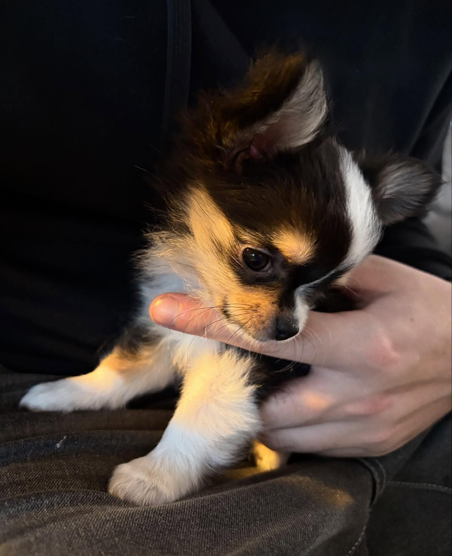 Adorable tri-color fluff ball with beautiful brown, black, and white markings, big sparkling eyes, and the softest fluffy coat! This tiny princess has the cutest face and those signature oversized ears. Sweet, gentle, and full of love — Nova is a perfect cuddly companion who will steal your heart the moment you meet her.