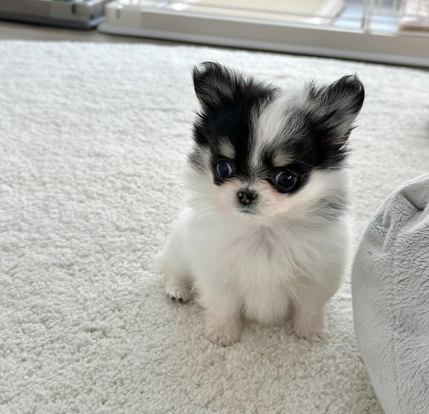 Adorable fluffy black & white princess with the most beautiful big sparkling eyes and a super soft coat! This tiny cloud of cuteness has a gorgeous merle-pattern face and a fluffy white tail that wags with joy. Sweet, gentle, and full of love, Bella is the perfect little lap dog who will melt your heart every day.